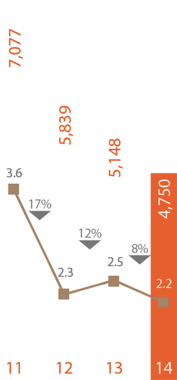 La generación de flujo de la compañía y su manejo adecuado, permitieron cumplir durante el año con todos los compromisos financieros y operativos, y seguir avanzando en la disminución del nivel de deuda de la compañía. Al cierre del 2014 la deuda se ubicó en $4,750 millones de pesos, mostrando una reducción del 8% en comparación a la deuda de $5,147 millones de pesos registrada al cierre del 2013. El índice de apalancamiento en términos de Deuda Neta a Ebitda se ubicó al final del año en 2.3 veces, comparándose favorablemente con el índice de 2.6 veces del 2013.