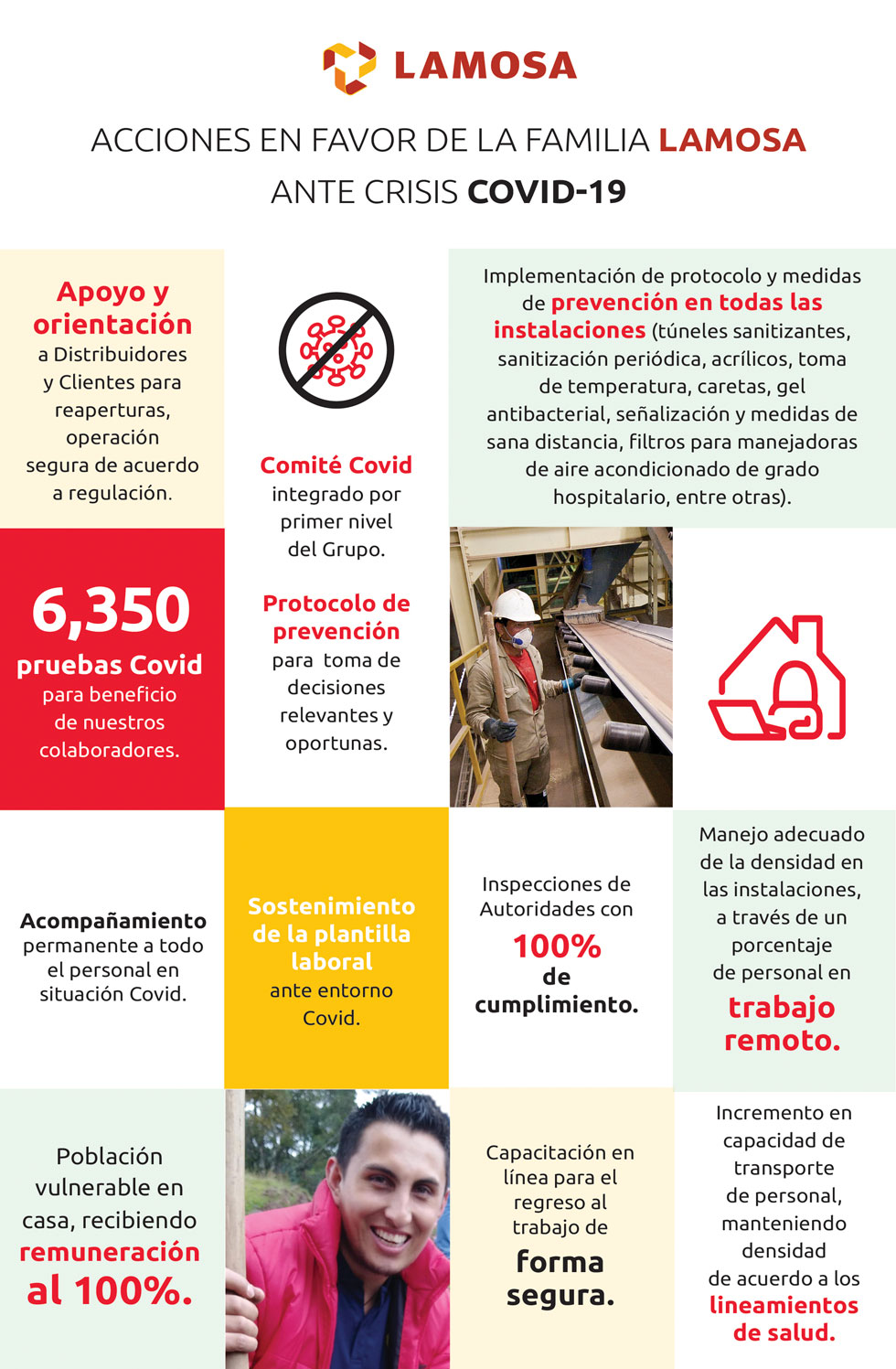 Durante el 2020 Grupo Lamosa enfocó sus acciones en apoyar diversos proyectos encaminados a atender la emergencia sanitaria provocada por el COVID-19, entre las instituciones apoyadas se encuentran La Cruz Roja, el Patronato del Hospital Materno-Infantil y la Casa de Reposo Luis Elizondo, entre otras.