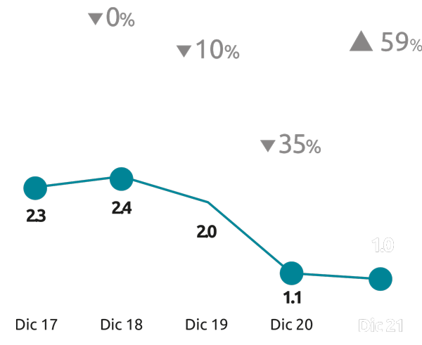 El crecimiento en los resultados y la mayor capacidad de generación de flujo de la compañía, contribuyeron a soportar las inversiones de $635 millones de pesos realizadas durante el año y a financiar parcialmente la adquisición por $241 millones de dólares del negocio de revestimientos de Grupo Roca, sin impactar el nivel de apalancamiento de la compañía. La deuda neta de Grupo Lamosa al cierre del año ascendió a $7,311 millones de pesos mostrando una relación de Deuda Neta a Ebitda de 1.0 veces, menor a la relación de 1.1 veces registrada al cierre del 2020.